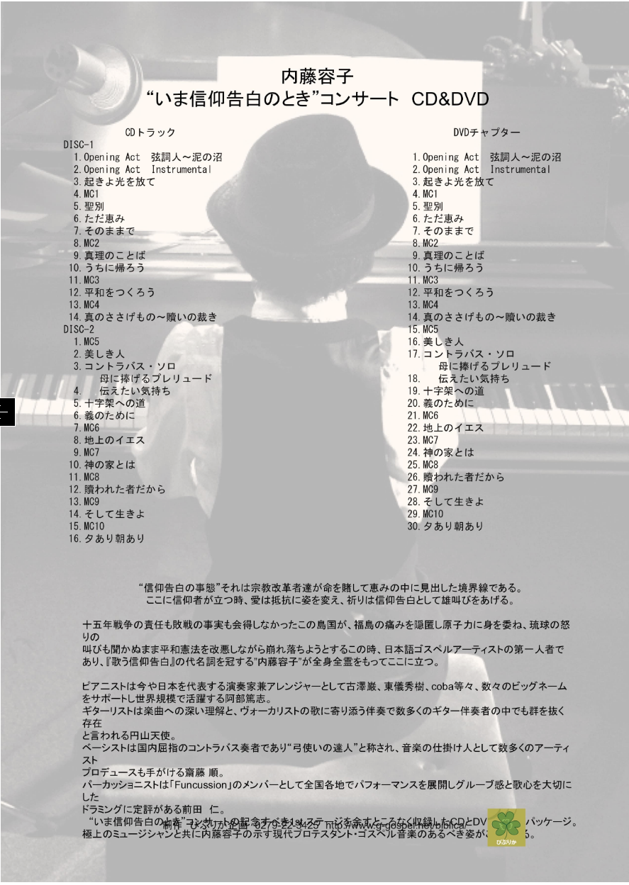 「神の言葉の説教は、神の言葉である」(第二スイス信仰告白)とは宗教改革者達の導かれた深淵な告白である。この告白通り聖書に立ち返った神の教会は聖書の説教によって導かれ、養われ続け、立て上げられてきた。説教が斜陽化するとき教会も傾き、説教が研鑽されるとき教会は命を輝かせてきたのである。内藤容子の歌う信仰告白もまた同様に、神の言葉として教会とキリスト者を導き養っていることを示す多くの証言を得ている。それはとりもなおさず内藤の賛美が研鑽された説教であるからだ。この事実は先の言葉を借りるならば「神の言葉を歌う時、それは神の言葉である」と言わしめる極めて重要な知見に我らを導く。ここに真理の断片があるとすれば、優れた教会音楽アーティストの立つべき位置はこの国の教会において大きく見直されるべき必要があるのではないか。いや確かにその必要がある。